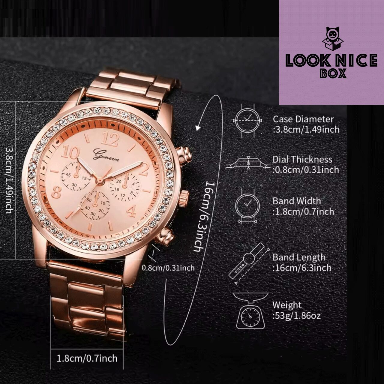 洗練されたスタイルを楽しんで!LOOK NICE BOXの「ピンクゴールド腕時計セット」は、トータルコーディネートを実現するための特別なアイテムです。この腕時計は、美しいピンクゴールドのケースと、煌びやかなラインストーンが施された文字盤が特徴で、カジュアルからフォーマルまで様々なシーンであなたのスタイルを引き立てます。身に着けることで、あなたの洗練されたセンスを一層際立たせることでしょう。