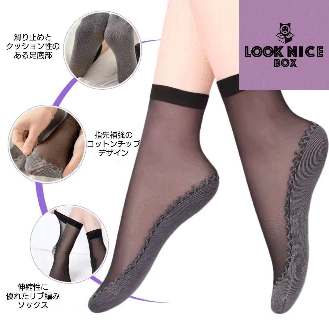 洗練されたスタイルを楽しんで!LOOK NICE BOXの「ローカットストッキング 2色カラー 素足美人」は、素足のように美しい仕上がりを実現するために特別にデザインされたアイテムです。10足セットで、滑り止めグリップ付きなので、日常使いや特別なシーンでも安心してご利用いただけます!通気性抜群で快適な着用感を実感し、さまざまな足にフィットし、あなたの魅力をしっかりと引き立てます。