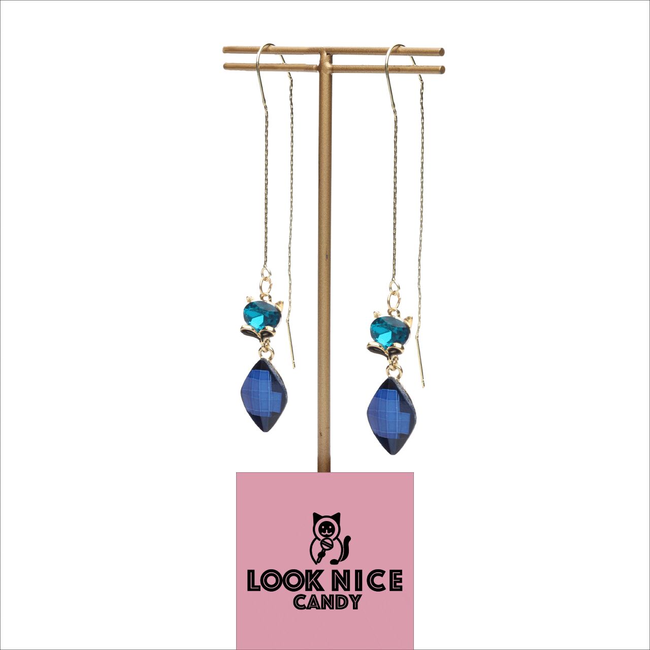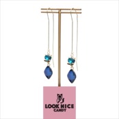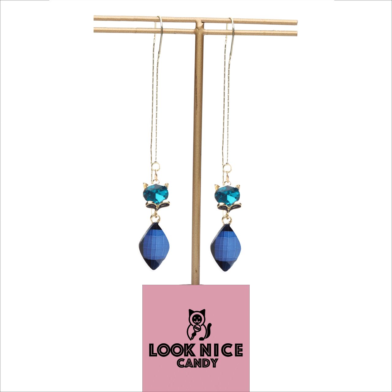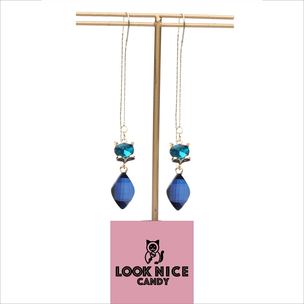 LOOK NICE CANDY ロングピアス ネコ モチーフ かわいい イエローゴールド ブルー カラーストーン