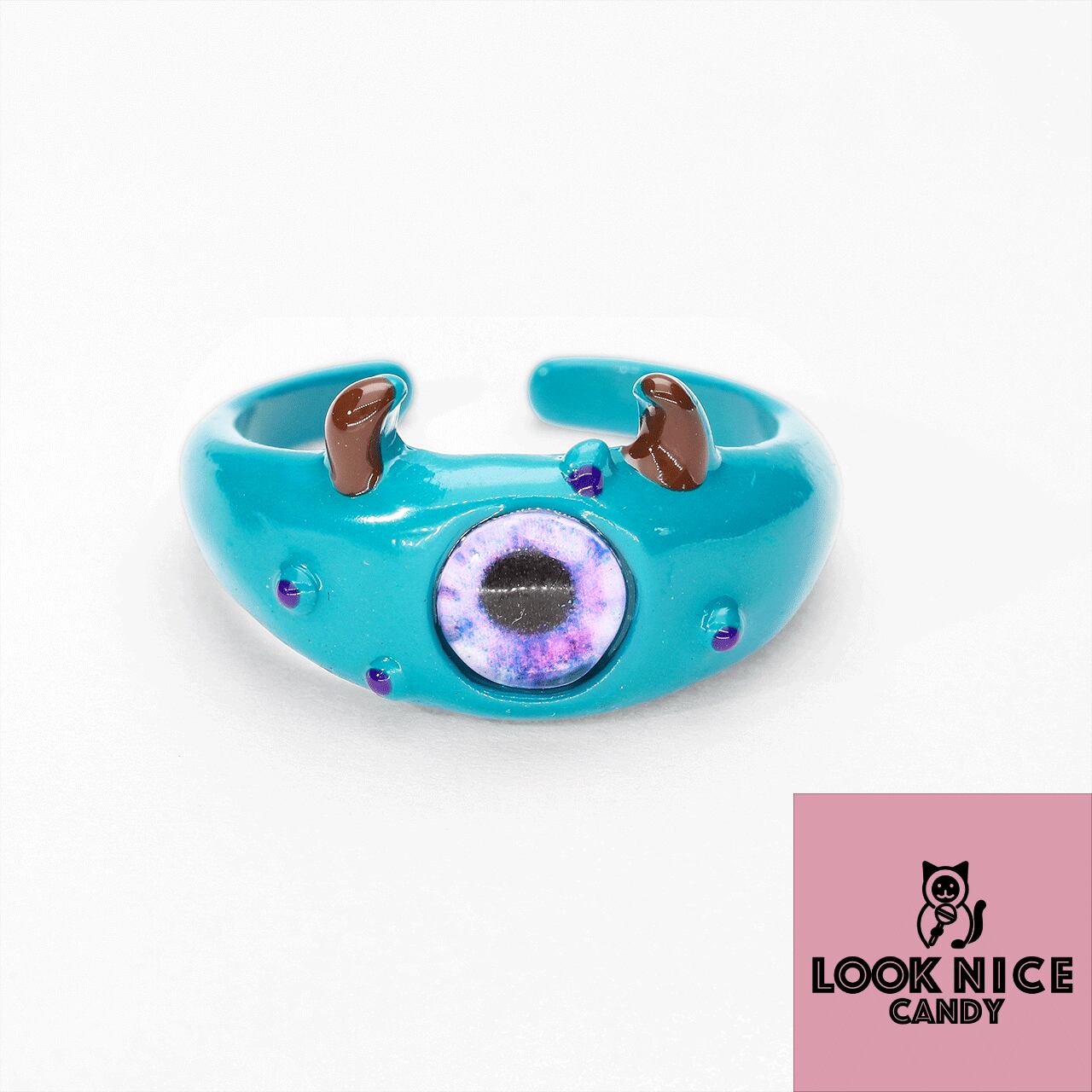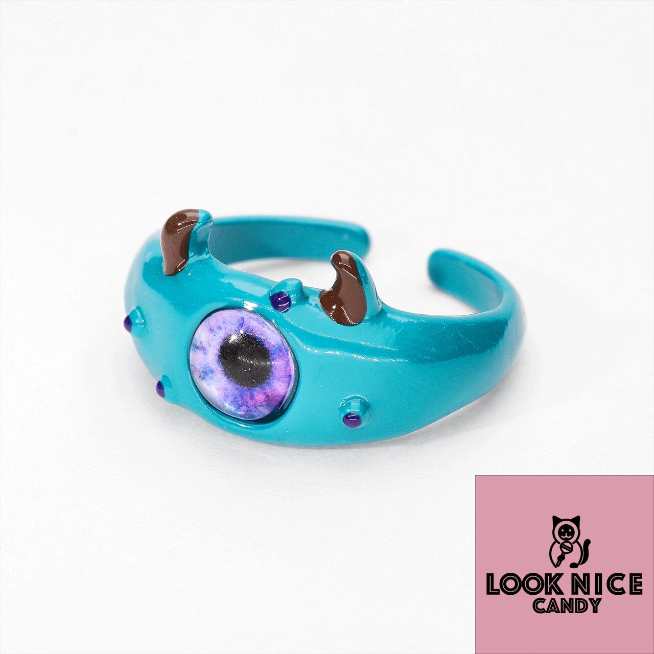 洗練されたスタイルを楽しんで!LOOK NICE CANDYの「ブルーモンスターリング サードアイ」は、ユニークで魅力的なデザインが特徴的なアイテムです。その目を引くブルーが、特別な日の装いに華を添え、パーティーシーンでも一際目を引くこと間違いなし!オープンリング仕様は、あなたの指にぴったりとフィットし、スタイリッシュなアクセサリーとして活躍します。