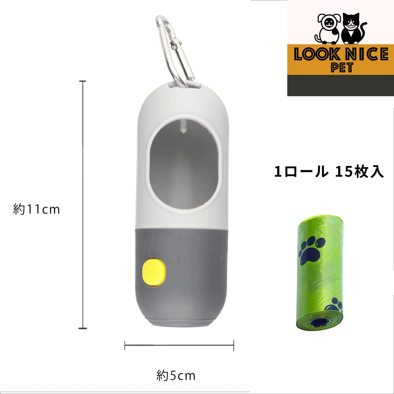 LOOK NICE PET ライト付きエチケット袋ケース ホワイト エチケット袋1ロール15枚入 犬 散歩 マナー袋 手軽 うんち袋入れ かわいい いぬ