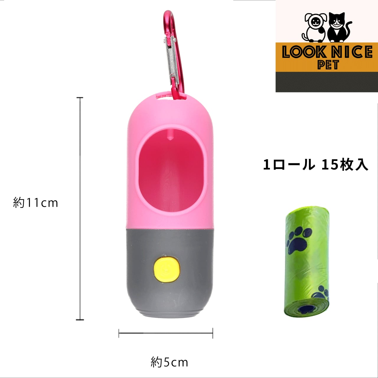 LOOK NICE PET ライト付きエチケット袋ケース ピンク エチケット袋1ロール15枚入 犬 散歩 マナー袋 手軽 うんち袋入れ かわいい いぬ