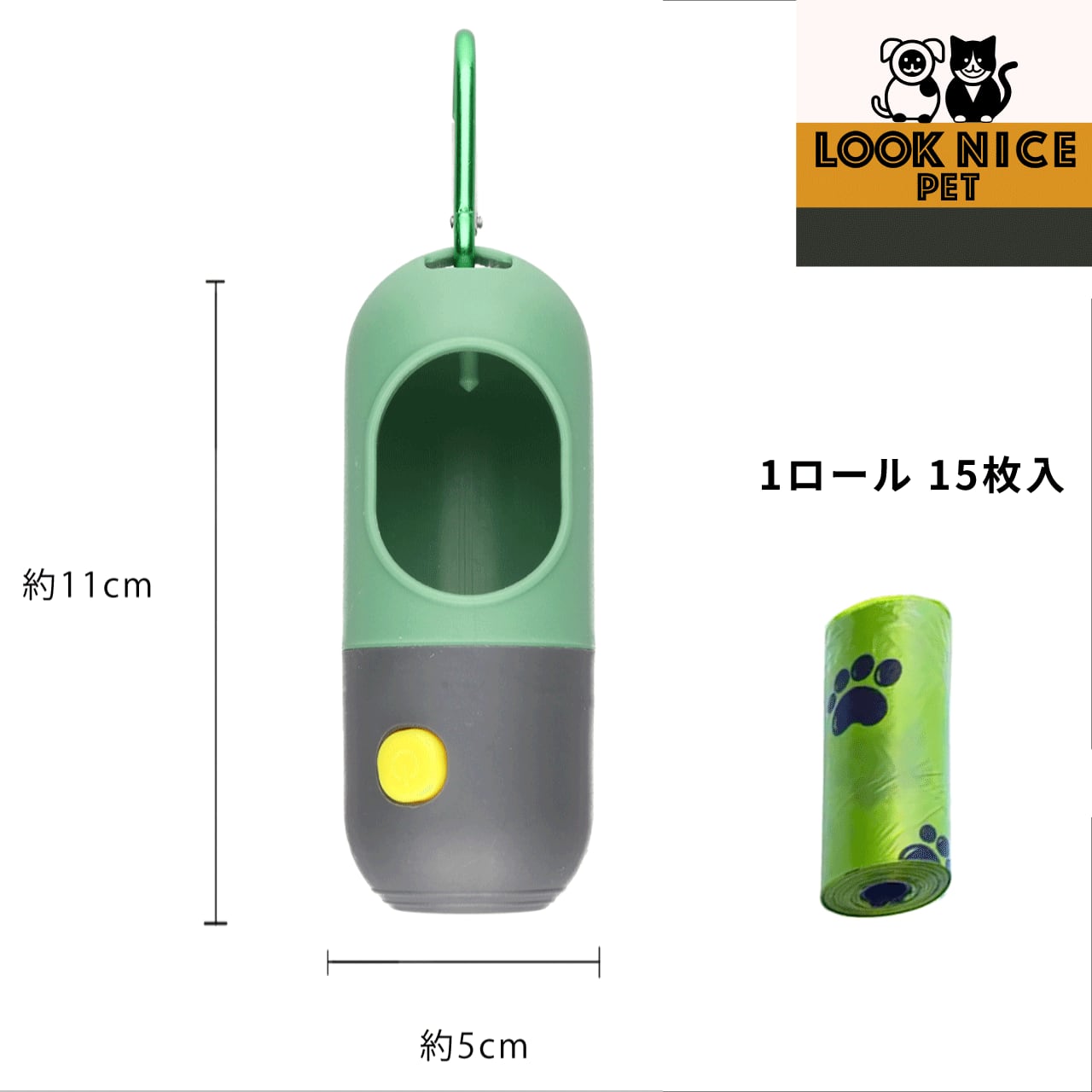 LOOK NICE PET ライト付きエチケット袋ケース グリーン エチケット袋1ロール15枚入 犬 散歩 マナー袋 手軽 うんち袋入れ かわいい いぬ